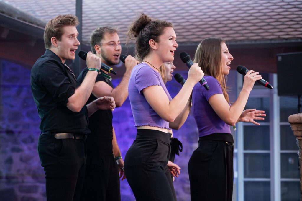 Im Juni wurden wir eine Woche lang in Kirchzarten – umgeben von singenden und singbegeisterten Menschen – im „Bandcamp“ von den ehemaligen Real Group Mitgliedern Katarina Henryson und Peder Karlsson gecoacht. Dort durften wir auch die wunderbaren Gruppen „Coig“, „Aember“ und „Quintabulous“ kennenlernen. Außerdem haben wir auf der Festivalbühne ein Konzert gesungen und standen in engem Austausch mit den aktuellen Mitgliedern der Real Group.